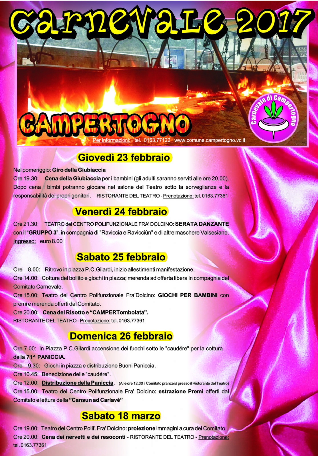 Ore 19.30: Cena della Giubiaccia per i bambini (gli adulti saranno serviti alle ore 20.00). Dopo cena i bimbi potranno giocare nel salone del Teatro sotto la sorveglianza e la responsabilità dei propri genitori. RISTORANTE DEL TEATRO - Prenotazione: tel. 0163.77361