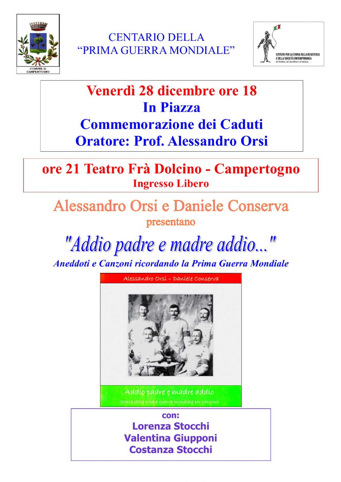 Ore 21 - Tatro del C.Pf.Fra' Dolcino: "Addio padre e madre addio...", aneddoti e canzoni per ricordare la Prima Guerra Mondiale. Con Alessandro Orsi e Daniele Conserva, Lorenza Stocchi, Valentina Giupponi, Costanza Stocchi.