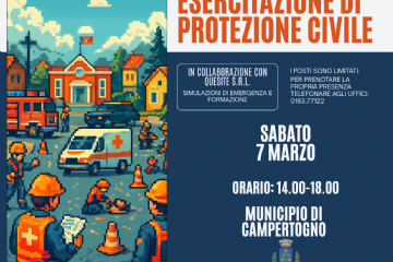 Venerdì 7 marzo, dalle 14.00 alle 18.00, il Comune di Campertogno ospiterà un’importante esercitazione di Protezione Civile presso la Sala Consigliare del Municipio, rivolta in modo particolare a...
