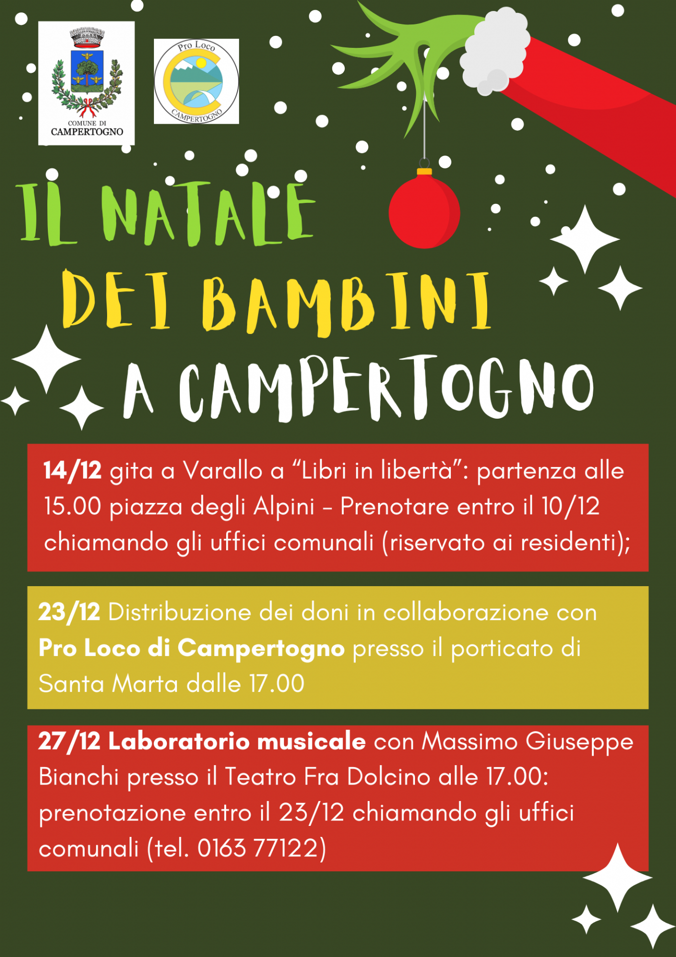 Laboratorio musicale con Massimo Giuseppe Bianchi presso il Teatro "Centro Polifunzionale Fra Dolcino" alle 17.00: prenotazione entro il 23/12 chiamando gli uffici comunali (tel. 0163 77122)