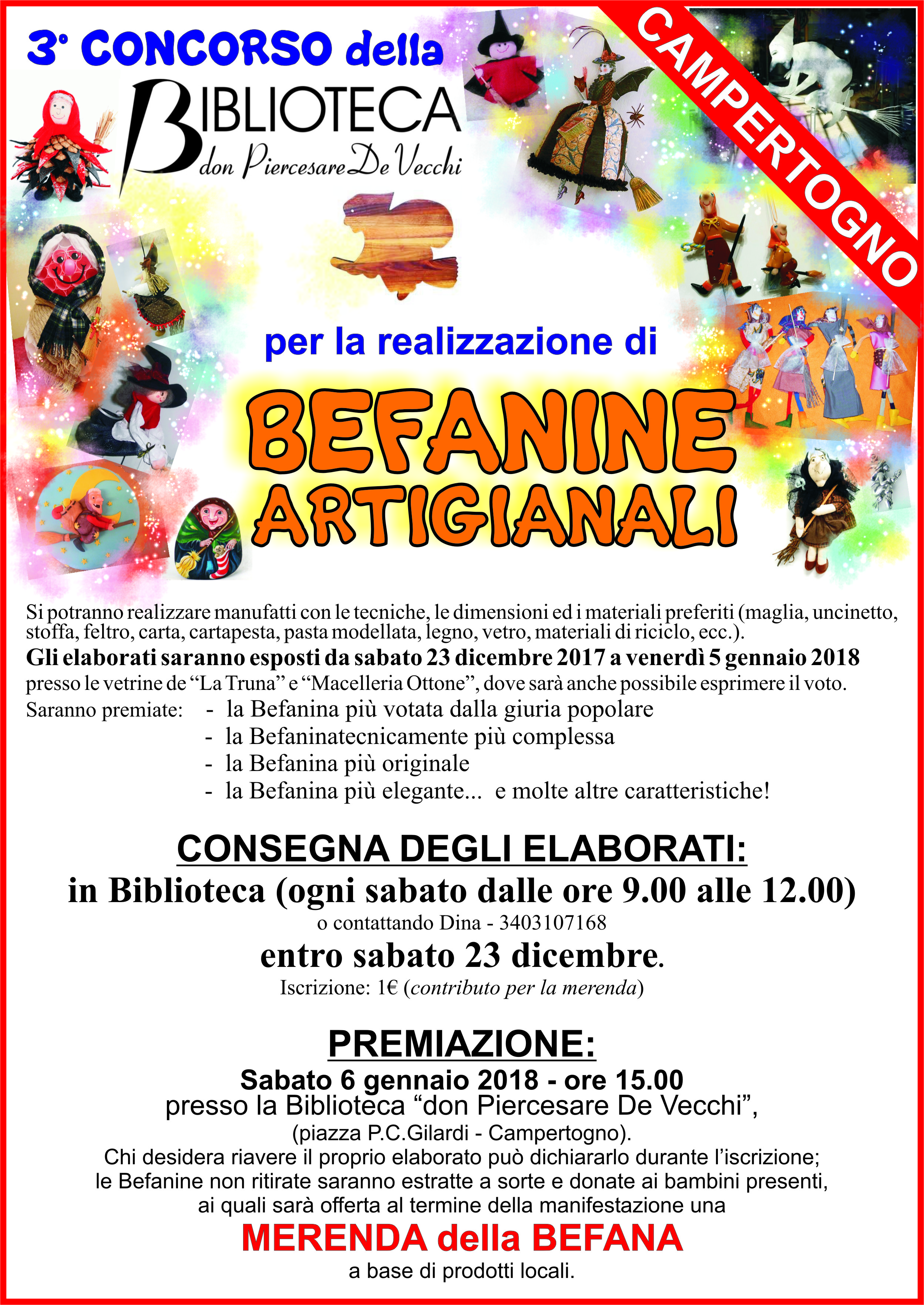 Chi desidera riavere il proprio elaborato può dichiararlo durante l’iscrizione; le Befanine non ritirate saranno estratte a sorte e donate ai bambini presenti, ai quali sarà offerta al termine della manifestazione una MERENDA della BEFANA