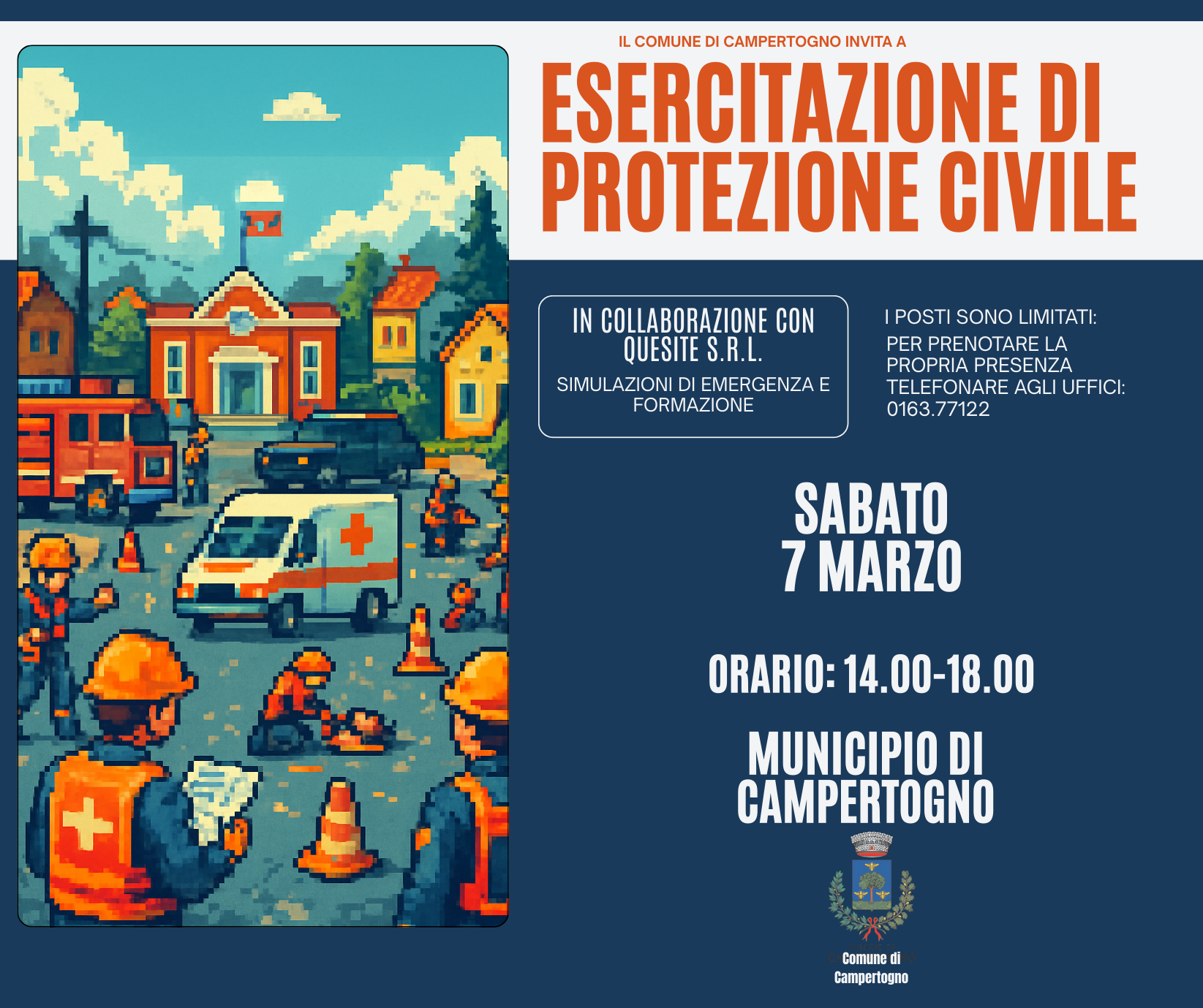 Venerdì 7 marzo, dalle 14.00 alle 18.00, il Comune di Campertogno ospiterà un’importante esercitazione di Protezione Civile presso la Sala Consigliare del Municipio, rivolta in modo particolare a aziende agricole, attività commerciali, ristoranti, strutture ricettive, ma aperta anche a tutti i cittadini interessati.